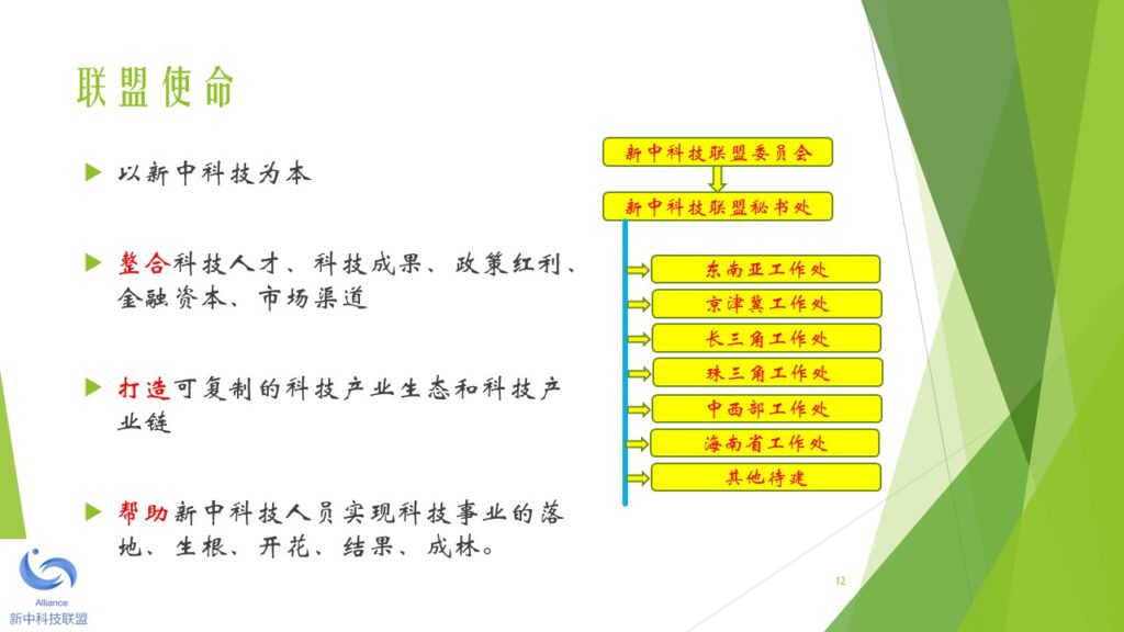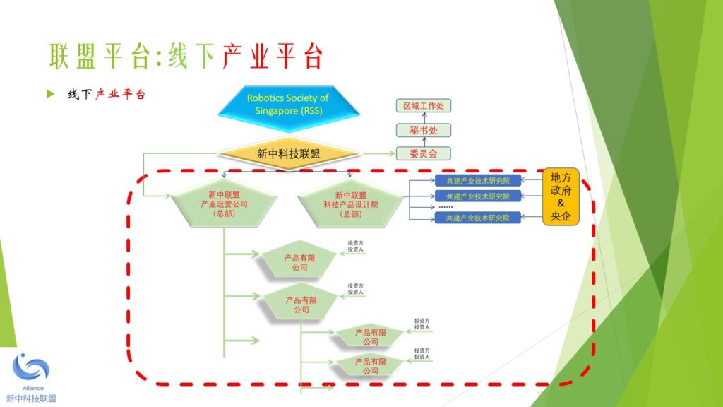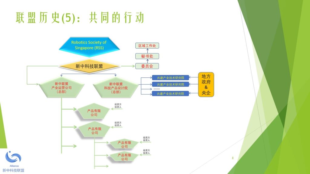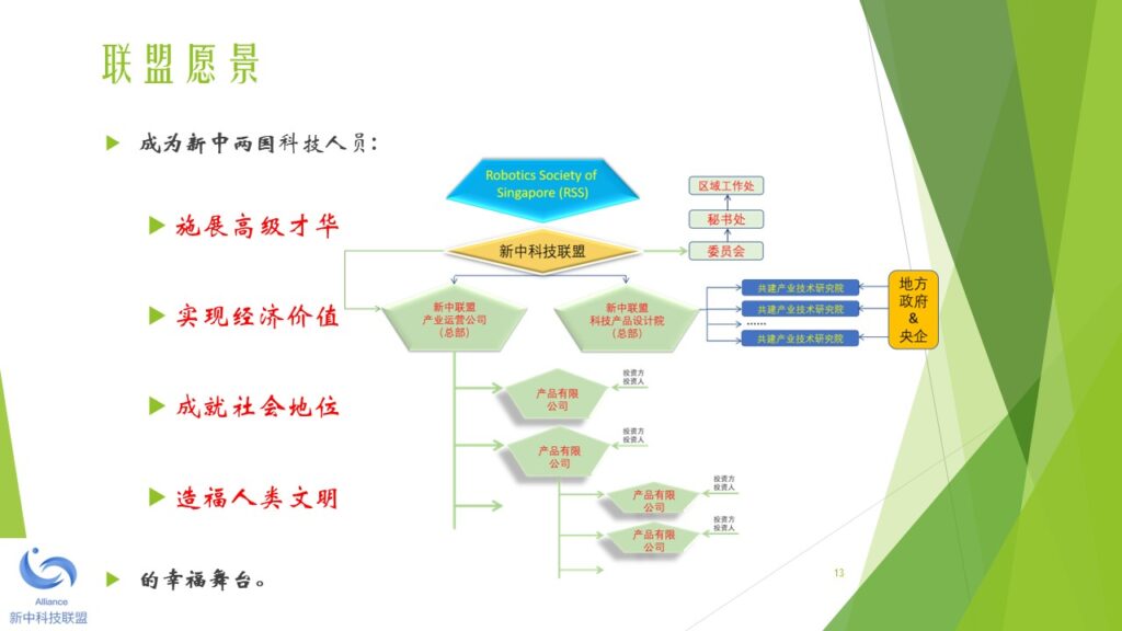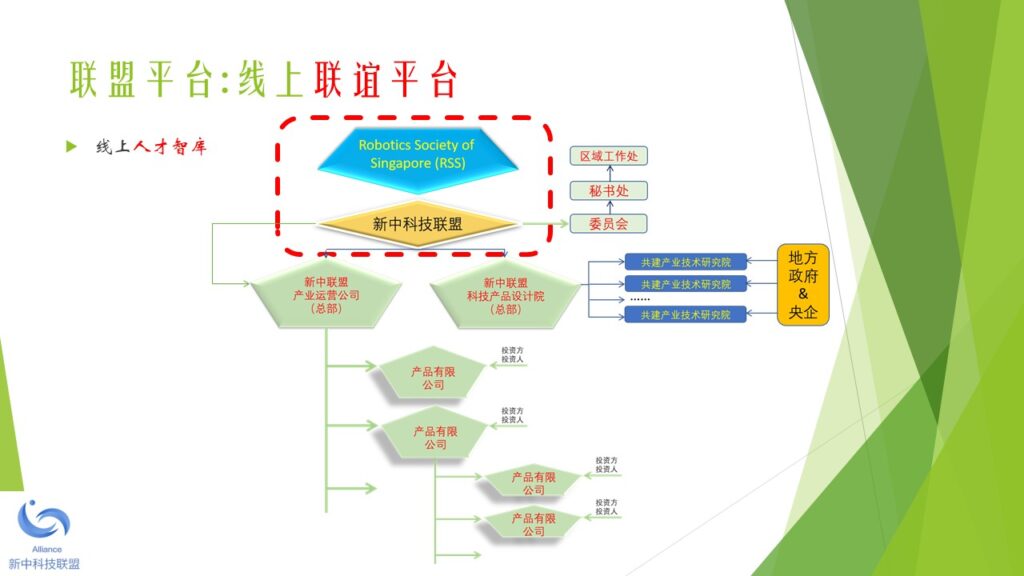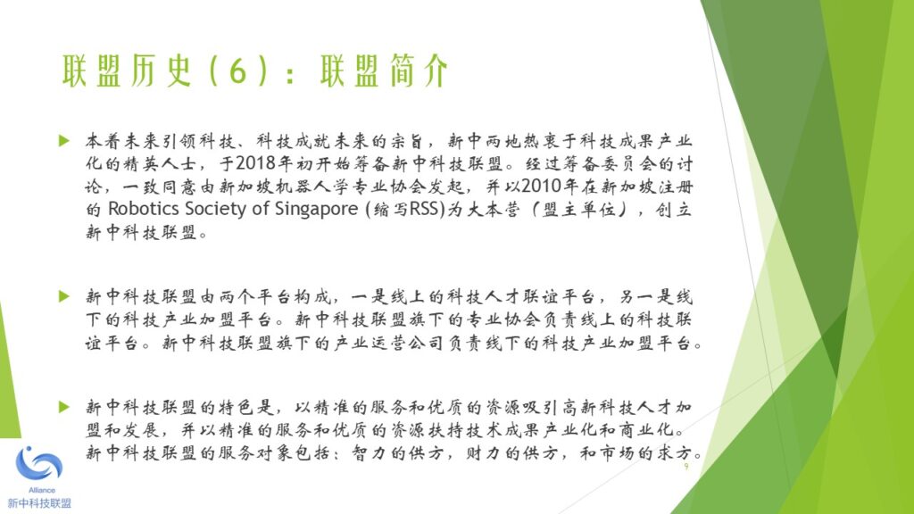 本着未来引领科技、科技成就未来的宗旨,新中两地热衷于科技成果产业化的精英人士,于2018年初开始筹备新中科技联盟。经过筹备委员会的讨论,一致同意由新加坡机器人学专业协会发起,并以2010年在新加坡注册的 Robotics Society of Singapore (缩写RSS)为大本营(盟主单位),创立新中科技联盟。 新中科技联盟由两个平台构成,一是线上的科技人才联谊平台,另一是线下的科技产业加盟平台。新中科技联盟旗下的专业协会负责线上的科技联谊平台。新中科技联盟旗下的产业运营公司负责线下的科技产业加盟平台。 新中科技联盟的特色是,以精准的服务和优质的资源吸引高新科技人才加盟和发展,并以精准的服务和优质的资源扶持技术成果产业化和商业化。新中科技联盟的服务对象包括:智力的供方,财力的供方,和市场的求方。 新中科技联盟下设一个委员会和一个秘书处。委员会的职能是在发展战略和战术层面做好顶层设计和规划。秘书处的职能是在机构行政(政策、制度、流程)和执行(统一思想、统一行动、实现结果)层面做好精准的服务和关爱。 为了加强秘书处的工作力度和效果,新中科技联盟下设多个区域工作处,每个区域工作处设主任一名副主任四名。区域工作处由秘书处统一调度和指挥。目前,新中科技联盟设立的第一批区域工作处包括:东南亚工作处,京津冀工作处,长三角工作处,珠三角工作处,云贵川工作处,陕甘豫工作处。其他的区域工作处,成熟一个,成立一个。