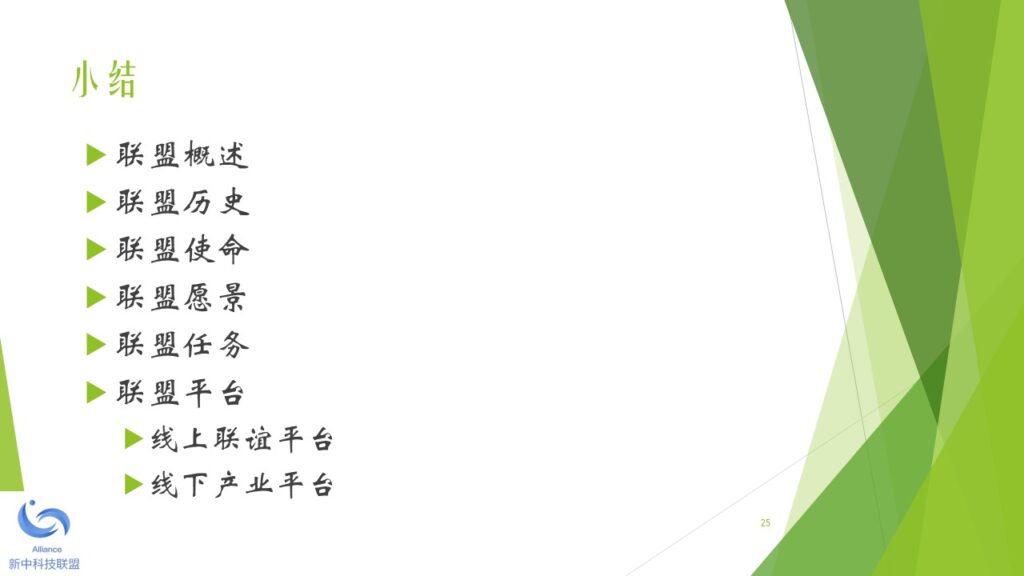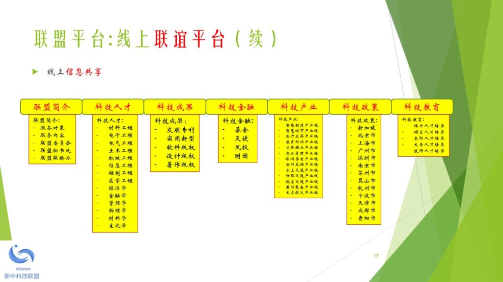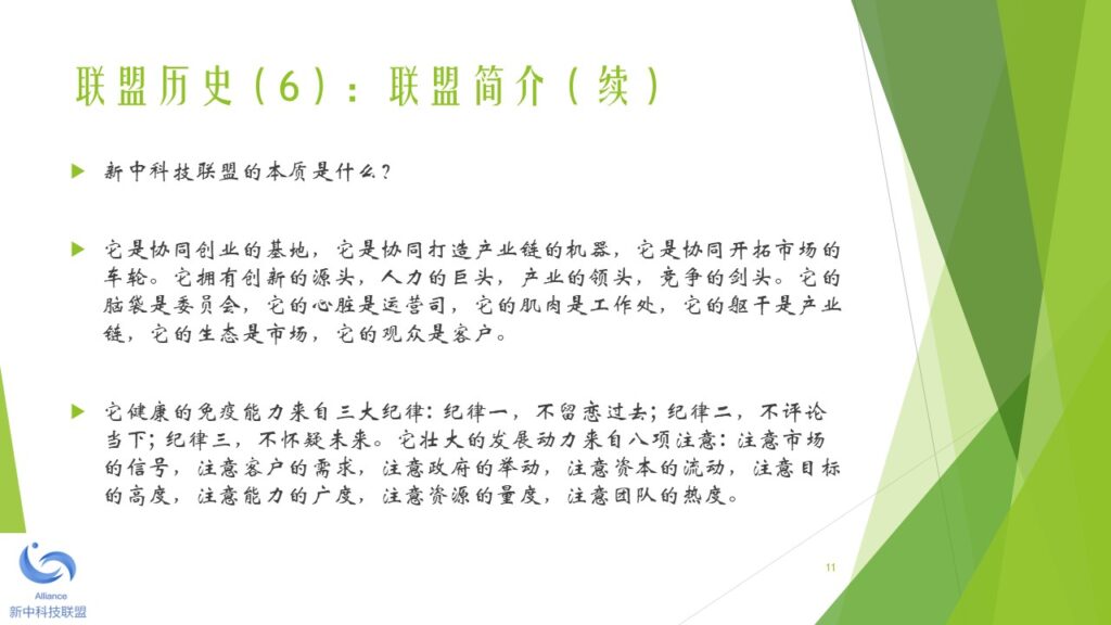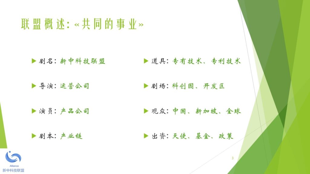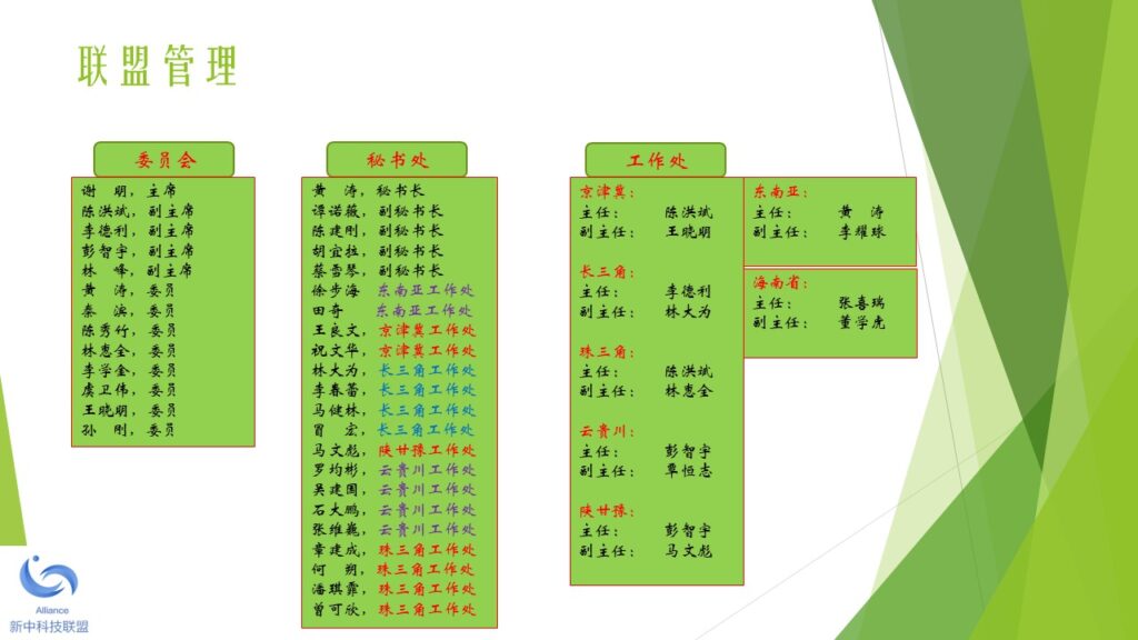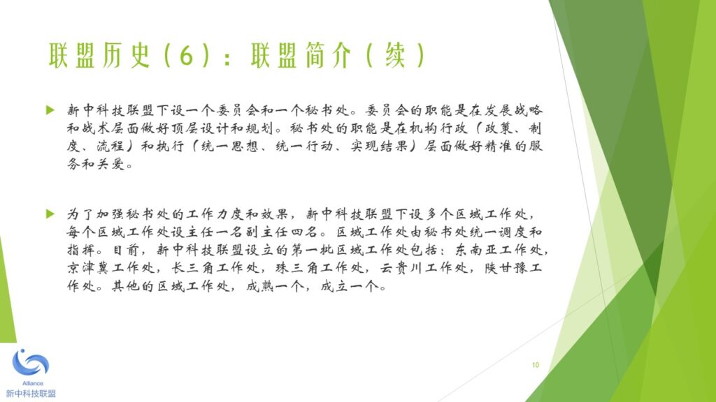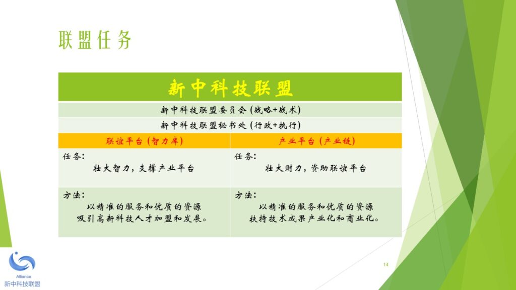 本着未来引领科技、科技成就未来的宗旨,新中两地热衷于科技成果产业化的精英人士,于2018年初开始筹备新中科技联盟。经过筹备委员会的讨论,一致同意由新加坡机器人学专业协会发起,并以2010年在新加坡注册的 Robotics Society of Singapore (缩写RSS)为大本营(盟主单位),创立新中科技联盟。 新中科技联盟由两个平台构成,一是线上的科技人才联谊平台,另一是线下的科技产业加盟平台。新中科技联盟旗下的专业协会负责线上的科技联谊平台。新中科技联盟旗下的产业运营公司负责线下的科技产业加盟平台。 新中科技联盟的特色是,以精准的服务和优质的资源吸引高新科技人才加盟和发展,并以精准的服务和优质的资源扶持技术成果产业化和商业化。新中科技联盟的服务对象包括:智力的供方,财力的供方,和市场的求方。 新中科技联盟下设一个委员会和一个秘书处。委员会的职能是在发展战略和战术层面做好顶层设计和规划。秘书处的职能是在机构行政(政策、制度、流程)和执行(统一思想、统一行动、实现结果)层面做好精准的服务和关爱。 为了加强秘书处的工作力度和效果,新中科技联盟下设多个区域工作处,每个区域工作处设主任一名副主任四名。区域工作处由秘书处统一调度和指挥。目前,新中科技联盟设立的第一批区域工作处包括:东南亚工作处,京津冀工作处,长三角工作处,珠三角工作处,云贵川工作处,陕甘豫工作处。其他的区域工作处,成熟一个,成立一个。